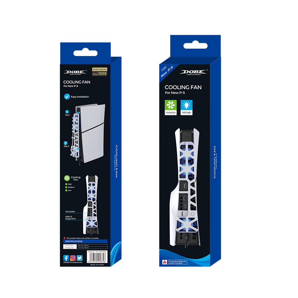 فن خنککننده Dobe برای PS5 Slim یک وسیله جانبی با سه فن قابل تنظیم است که برای کمک به دفع حرارت کنسول طراحی شده و از طریق پورت USB پشت کنسول تغذیه میشود.