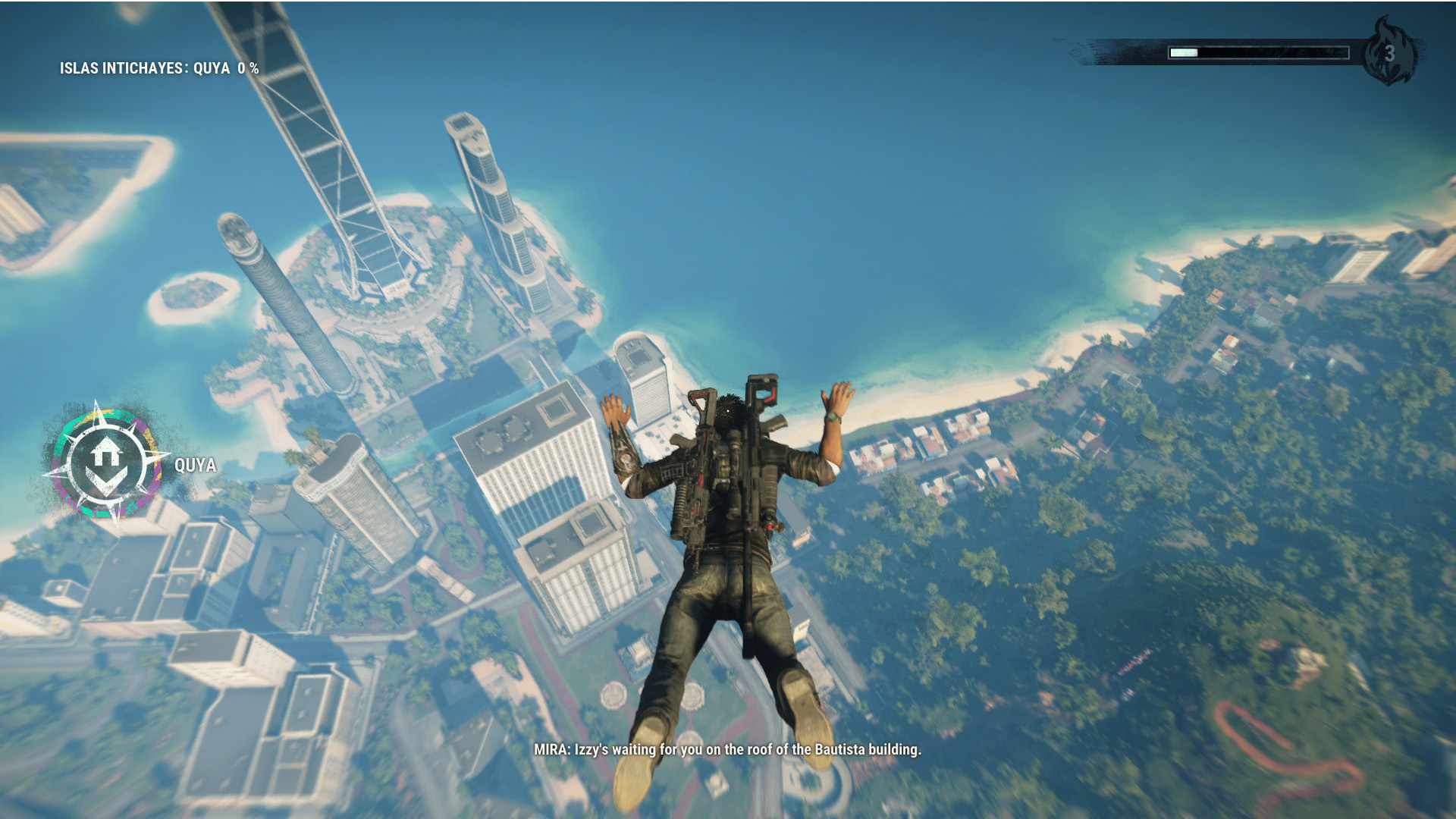 بازی در کشور خیالی Solis در آمریکای جنوبی روایت میشود، جایی پر از مناظر متنوع مثل جنگل، بیابان، کوههای یخزده و شهرهای مخروبه. شخصیت اصلی، ریکو رودریگز (Rico Rodríguez)، برای کشف حقیقت پشت گذشتهاش وارد Solis میشود و با نیروی نظامی خصوصی و سرکوبگر به نام The Black Hand مواجه میشود. یکی از نکات برجسته بازی وجود شرایط جوی شدید و غیرمنتظره مثل طوفانها، گردبادها و رعد و برق است که نه تنها جلوه بصری دارند، بلکه بر گیمپلی تأثیر میگذارند.