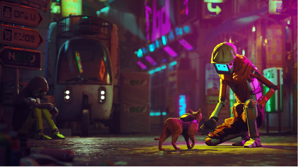 در Stray بازیکن در نقش یک گربه ولگرد قرار میگیرد که در شهری سایبرپانکی و پر از رباتها و نئونها گم شده است.