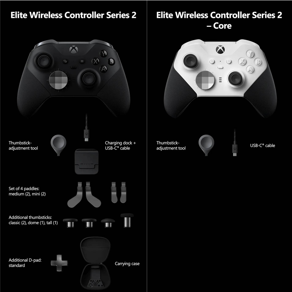 Elite Series 2 نسخه‌ی کامل است و همراهش تمام لوازم جانبی می‌آید: پدال‌های پشت، استیک‌های قابل تعویض، D-Pad اضافه، کیس حمل و داک شارژ.
